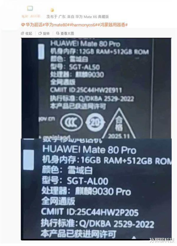 华为Mate80 Pro选择12GB内存版本搭载麒麟9030处理器,16GB内存版本搭载麒麟9030 Pro处理器